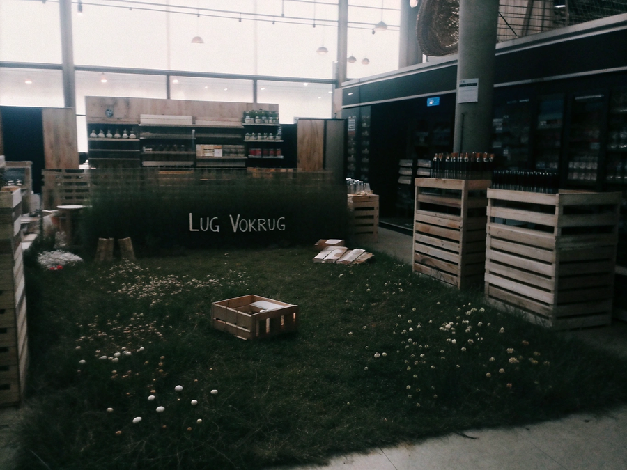 A small pop-up stand inside a grocery store, with 'Lug Vokrug' products displayed prominently in the foreground. The setup features eco-friendly items like seed-paper tableware, reusable bottles, and other sustainable products. In the background, there’s a small patch of grass and wildflowers, creating a natural meadow feel. The rest of the store is unchanged, and soft, warm lighting highlights the products.