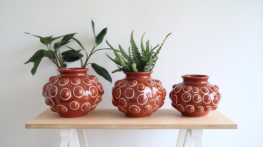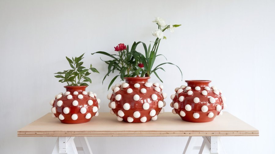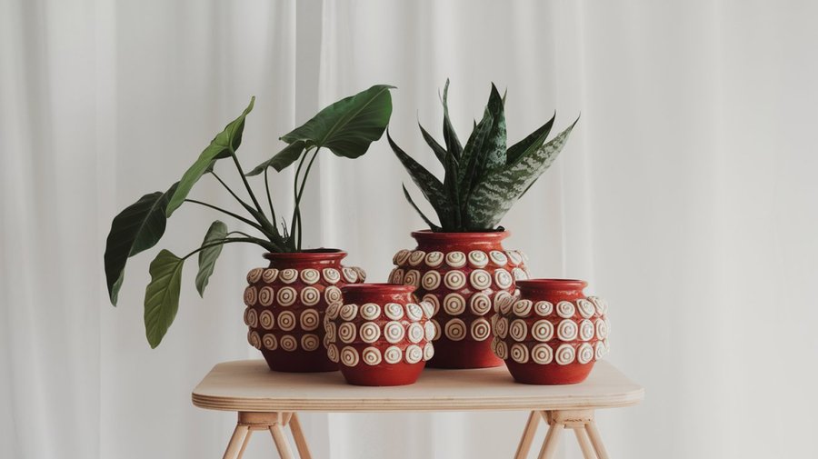 red clay pots with a bubble relief, pleasant to touch, white pattern, the pots are on a wooden table, white background, minimalism, the pots are glossy