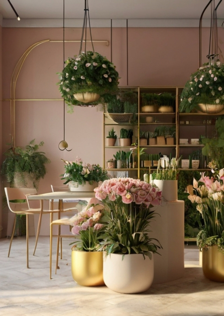 Leonardo.Ai[interior]: modern interior for a florist company, surrounded by plants, greenery and flowers create a feeling of freshness and closeness to nature, pastel and golden colours, glass