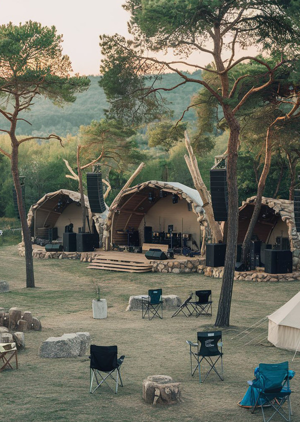 imagine prompt: create a space for a music festival in nature called Prirodnik in a naturally minimalist style in natural shades