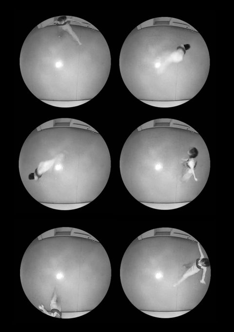 При беглом взгляде можно увидеть много маленьких кружочков, в которых происходит движение. Но если присмотреться, окажется, что в них человек пытается делать акробатическое колесо по периметру комнаты. Снято видео в полной темноте камерой ночного видения.