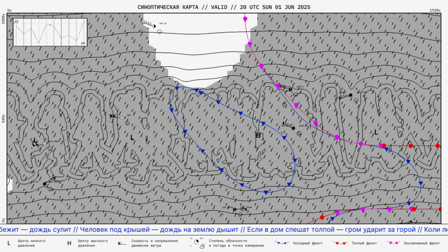 В основе принципа работы инсталляции — спекулятивные погодные приметы по людям. Например: