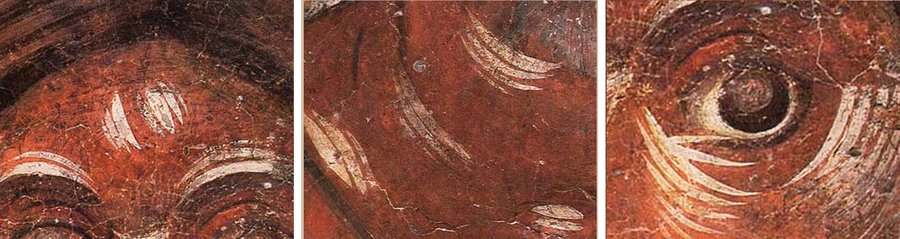 В данном фрагменте художник наносит штрихи поверх кожи. В основном вокруг глаз, акцентируя внимание на лице. А именно — на взгляде, который пронзает зрителя насквозь. На шее художник наносит штрихи, чтобы уравновесить акценты на лице. Ассисты у Феофана сильно контрастны с основной палитрой, что невольно привлекает внимание зрителя.