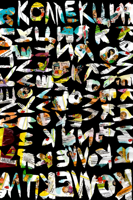 Плакат к выставке на тему «Коллекция». В основе лежит набросок маркером со словом «коллекция», принцип «закладки» и коллекция вещей.