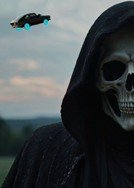 Промпт: «the car is flying soft light 2000s grain», за референс стиля взята одна из сгенерированных работ.