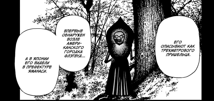 Изображение и описание Флэтвудского монстра в манге «Дандадан» на основе иллюстрации нью-йоркского художника // Изображение Флэтвудского монстра, созданное нью-йоркским художником для телешоу