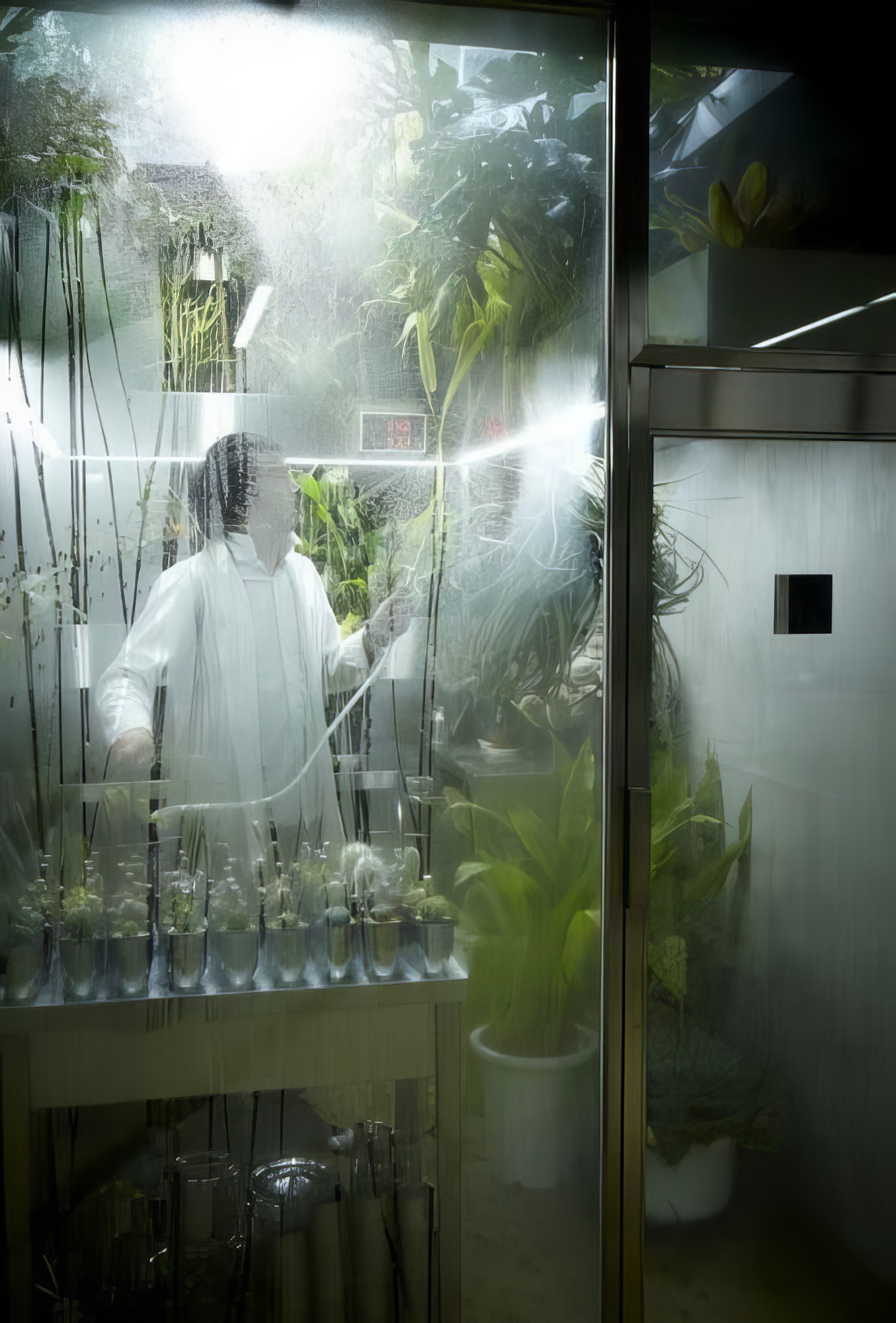 Изображение 4. An environment photo of a modern laboratory for the 35°C botanical brand, where herbs are cultivated and specialists work. Researchers in clean, structured attire carefully handle plants, documenting processes with a balance of clinical precision and organic authenticity.