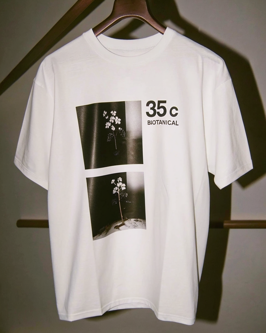 Изображения 5. A photo of a minimalist merch T-shirt for the 35°C brand, reflecting radical monochrome aesthetics. The design should feature bold black-and-white typography, sharp contrasts, and botanical engraving-inspired elements, inspired by scientific botanical studies and structured compositions. The T-shirt should have a modern, structured fit with clean lines and high-quality fabric, embodying the brand’s balance between clinical precision and organic authenticity
