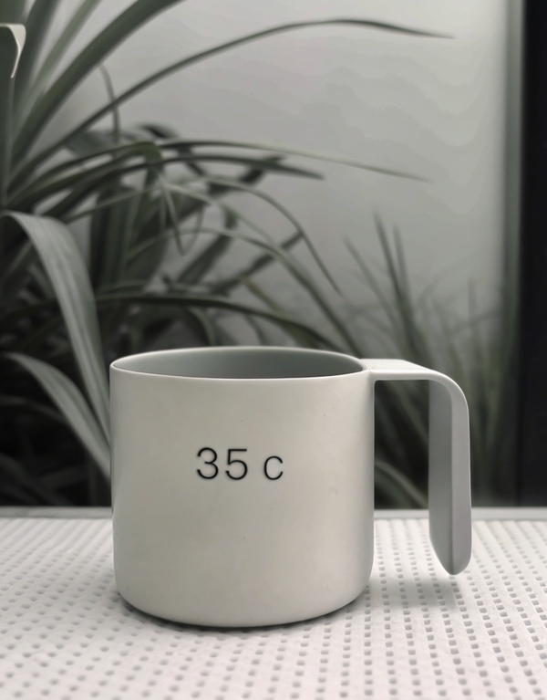 Изображения 1. An image of a minimalist mug designed for the 35°C brand, reflecting radical monochrome aesthetics. The mug should have a smooth, sculptural form with a seamless black-and-white design, inspired by scientific botanical engravings and structured compositions. The handle should be ergonomic yet minimal, either fully integrated or elegantly curved. The material should feel tactile and high-quality, such as matte ceramic or frosted glass. The branding should be subtle yet precise, using bold, structured typography or engraved details, maintaining the balance between clinical precision and organic authenticity.