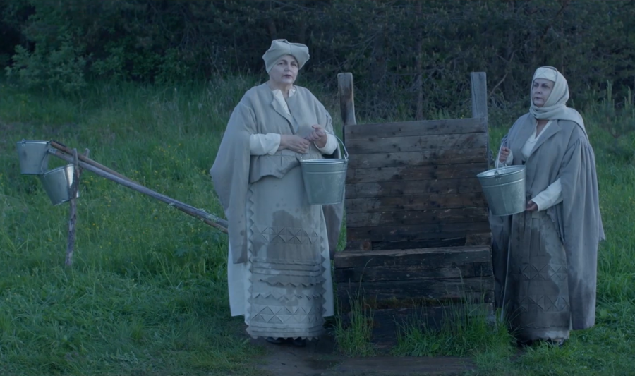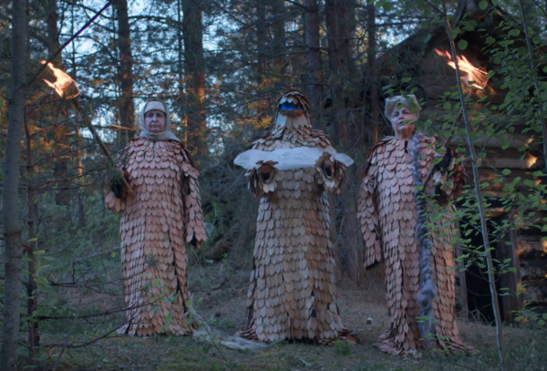 Начать я бы хотела с видеоработы Ульяны Подкорытовой «Тамотка» — яркого примера переосмысления фольклора современным искусством. Опираясь на сказки поморских писателей Писахова и Шергина и народную культуру Русского Севера, художница создаёт не стилизацию, а новую мифологию. Её героиня, облачённая в деревянные доспехи из храмовых лемехов, творящая древнее заклинание, спасающее реку, больше напоминает современного супергероя, чем традиционный народный образ.