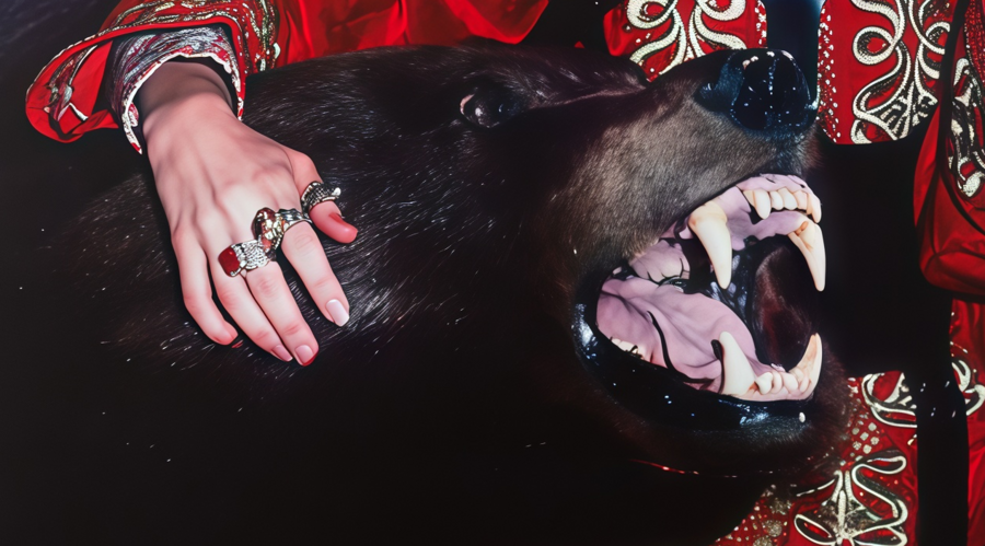 Медведь в этой сцене тоже преображается, из доброго друга становясь опасным диким зверем. Его оскал нарушает привычную сказочную идиллию, создавая ощущение скрытой угрозы.