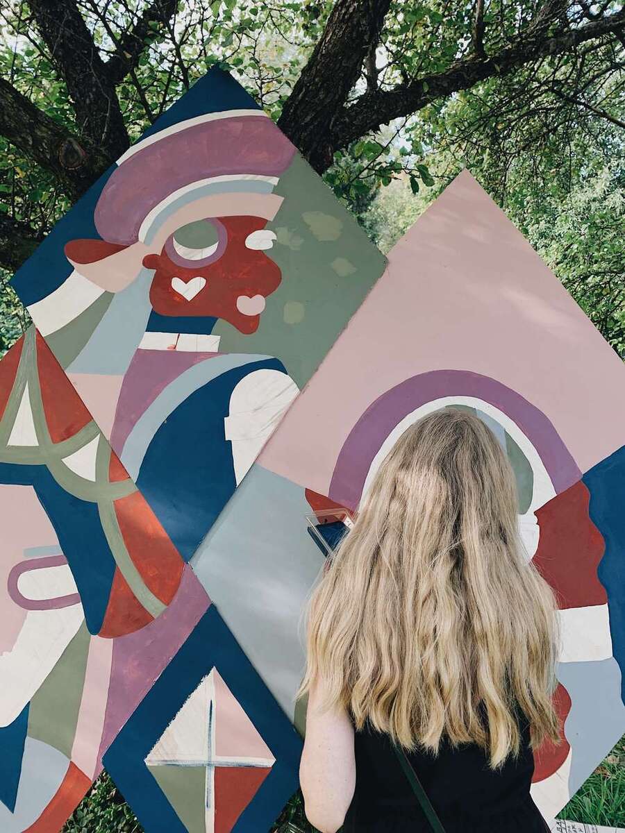 По-другому женский сказочный архетип деконструирует Ольга Чикина: обращаясь к известным девицам под окном, в своей картине «Три девицы над окном», 2019, Ольга фрагментирует целостный образ на геометрические фигуры, заключая каждую девушку в отдельный ромб — можно поразмышлять про мотив женского одиночества, например, социального. Мотив окна, центральный в композиции, утрачивает свою функцию «связи с миром», становясь столь же абстрактным, элементом узора.