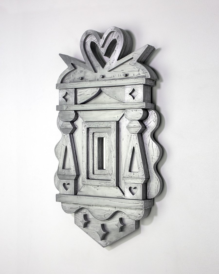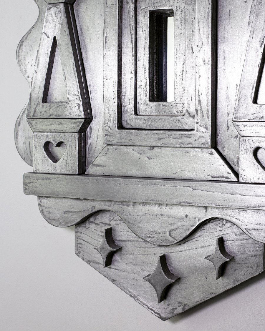 Работа Ольги Иней «Чур меня», 2024 представляет собой сложный синтез двух архетипических пограничных образов — окна и зеркала, — объединенных общей мифологической функцией границы между мирами. Художница проводит деконструкцию традиционных символов, создавая гибридный объект, в котором оконный наличник обрамляет не окно, а зеркальную поверхность. Этот прием радикально переосмысляет оба архетипа: окно как портал в иной мир («мир мертвых») и зеркало как опасный магический инструмент для гаданий, способный выпустить «черта».