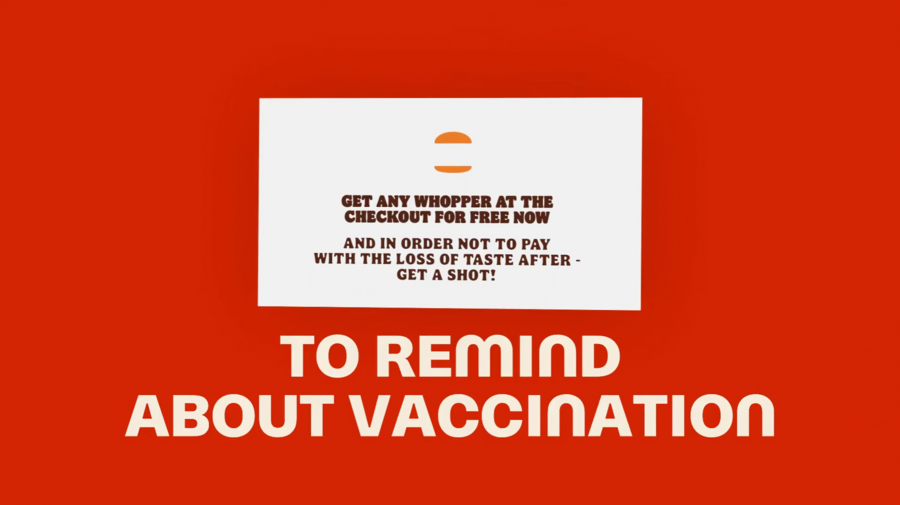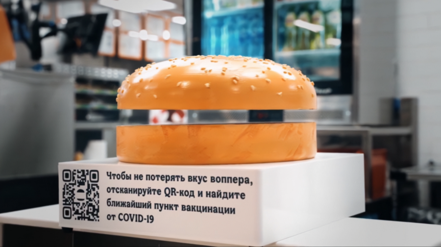 В ресторанах посетителям выдавали такие «пустые» булки вместо настоящих — вместе с QR-кодом, ведущим к карте пунктов вакцинации. Также был запущен «плавающий» билборд-корабль по Москве-реке с изображением уноса вкуса Whopper.