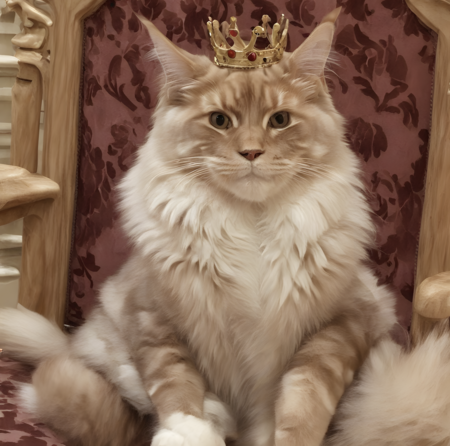 Промт: «a photo of SEMEN cat, A majestic cat king sitting on a throne, wearing an ermine robe and crown, baroque oil painting, dramatic lighting»