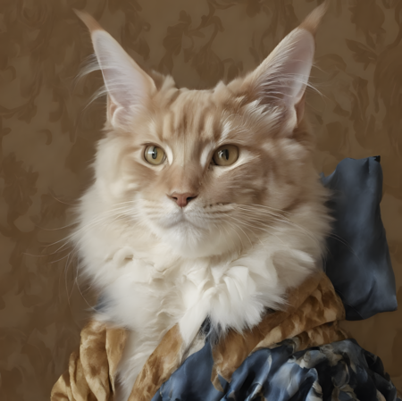Промт: «An intimate, candle-lit portrait of a cat king in a dark blue silk gown, his fur adorned with strands of pearls, his gaze direct and enigmatic, in the style of Johannes Vermeer»