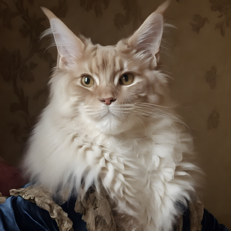 Промт: «a photo of SEMEN cat, A cat king of the Elizabethan era, wearing an immense ruff and a gown embroidered with celestial patterns, her court of other animals blurred and shadowy in the deep back