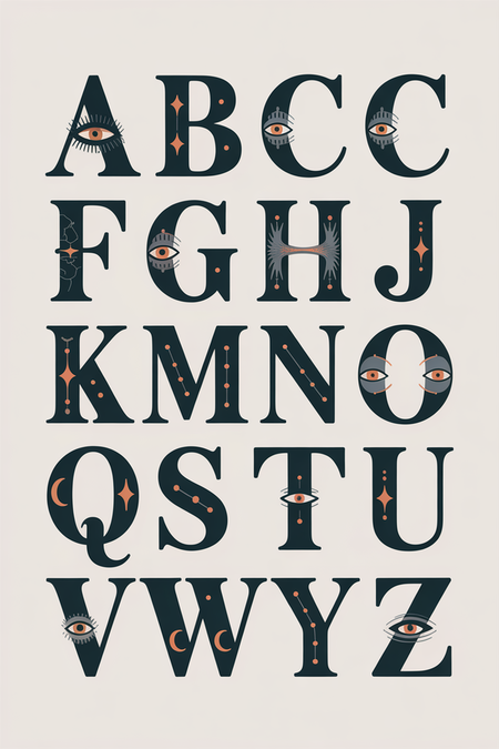 2. IdeogramAI: Create a new serif font. The letters should incorporate subtle occult elements like glowing eyes, arcane symbols, or faint constellations within the strokes. Use a color palette of dark teal, coral, and cream white. Render every letter of an alphabet: A, B, C, D, E, F, G, H, I, J, K, L, M, N, O, P, Q, R, S, T, U, V, W, X, Y, Z.