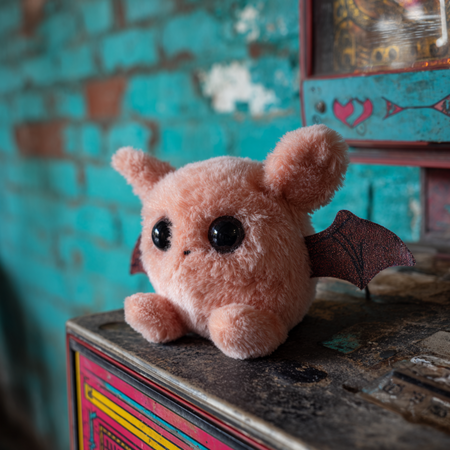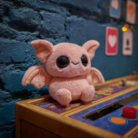 Midjourney: A photo of a close up shot of a soft fluffy toy of a cute pink bat like creature with large black circular eyes and tiny wings, sitting on a retro slot machine. In the background, the wall is constructed from dark blue brick walls, cracked and peeling, with social media icons (like hearts, comments, and profile silhouettes) barely visible beneath the surface. —version 7