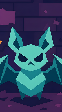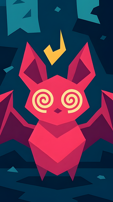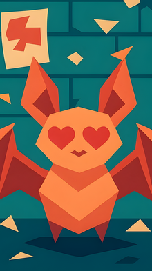 Sora: A stylized, flat vector illustration divided into three vertical panels, each showing the same stylized, low-poly bat-like creature in a different color scheme and emotional expression, set against a geometrically abstract arcade background. All elements are rendered in flat, saturated vector-style 2.5D polygonal art — no textures, no gradients, no shading, only sharp edges and solid color fills. Left panel: The creature is electric pink with hypnotic spiral eyes, standing in front of a dark blue brick wall with torn posters and floating debris. Background includes jagged geometric shapes in navy blue and yellow. Center panel: The creature is pale cyan with narrowed, angry-looking black eyes. Background is deep purple brickwork with floating torn paper and wires. Accent colors: lavender and warm amber. Right panel: The creature is coral-orange with heart-shaped pupils. Background is teal-green brick wall with red-and-white torn posters and geometric debris. Accent colors: burnt orange and cream. Style: Modern indie game art meets minimalist graphic design. Clean, sharp lines. Slight intentional geometric distortion for stylistic flair. No realism — pure stylized polygonal abstraction.