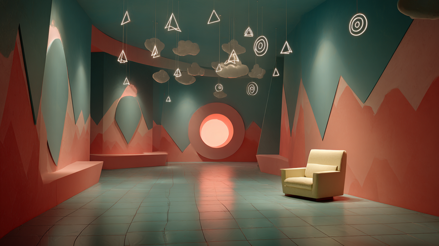 Midjourney: A flat color dream chamber: dark teal floor and ceiling, coral pink fog rendered as soft polygonal layers. Fiber optic stars are sharp white triangles and circles floating above. Mirrors on the walls show stylized alternate selves as simple coral silhouettes with spiral eyes. A single cream armchair faces a glowing coral orb. All objects have clean outlines, no shading. Geometric aesthetic. —version 7 —aspect 16:9