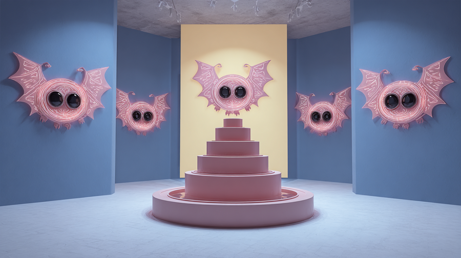 Midjourney: A photo of a warm minimal room: navy blue walls with yellow fabric panels showing projected faces as simple pink small cute coral bat like creature with large black spiral eyes and tiny angular coral wings with heart shaped eyes. A fountain is a stack of pink circles. Clean, gentle geometry. —version 7 —aspect 16:9
