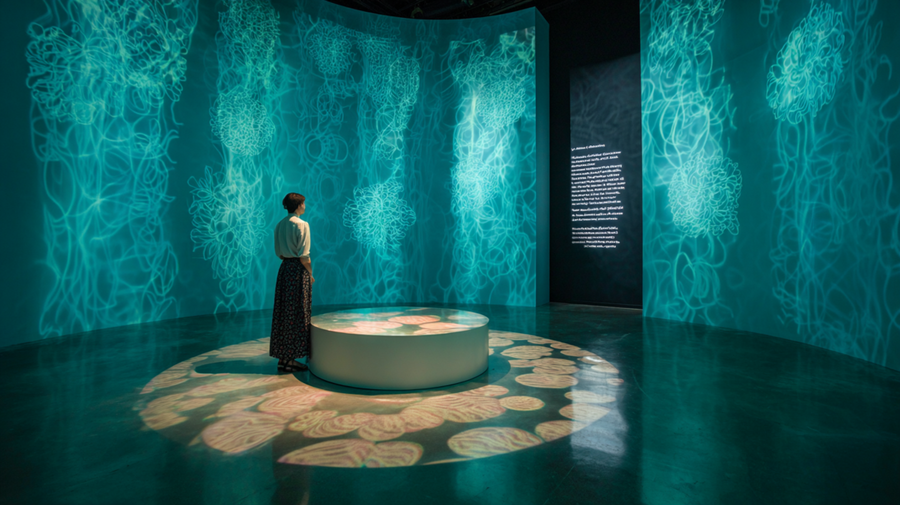 Midjourney: A photo of a circular room with dark teal floor and walls. Central pedestal is a layered coral cylinder. Projected tapestries on walls are abstract patterns of coral, cream, and black geometric shapes. The screen is a black rectangle displaying prophecy text in bold white font. A person standing in a center. —version 7 —aspect 16:9