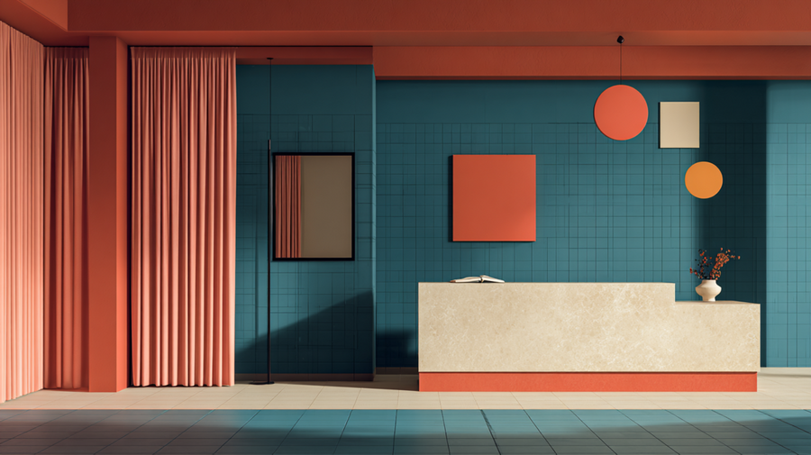 Midjourney: A photo of a minimalist room with flat color blocks: dark teal brick walls, coral pink velvet curtain, cream white reception desk. A large mirror is framed in black. On the desk sits an open journal. No textures, no gradients. Clean lines only. Floating geometric shapes (circles, squares) hover near the ceiling in coral and cream. —version 7 —aspect 16:9
