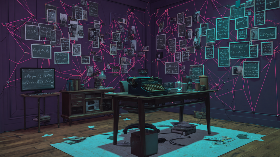 Midjourney: A photo of a stark lab in colors: deep purple walls with grid lines in warm amber, pale cyan chalkboards displaying formulas as bold black text. A black desk holds a typewriter with warm amber keys and red string connecting profile photos as geometric dots. —version 7 —aspect 16:9