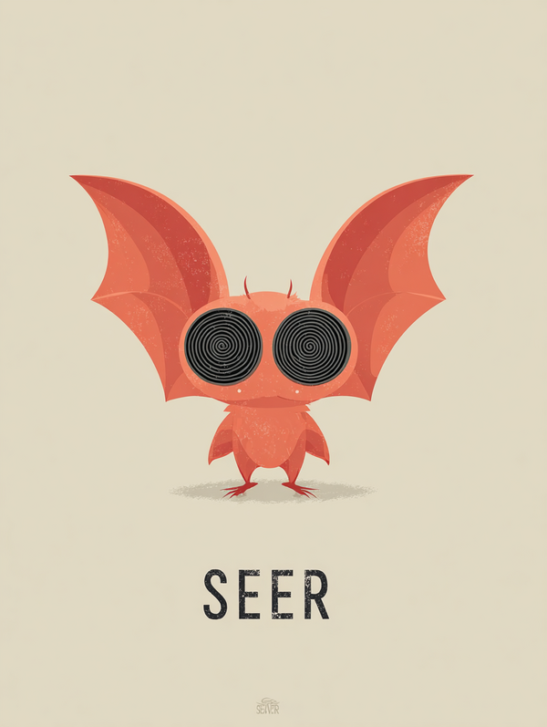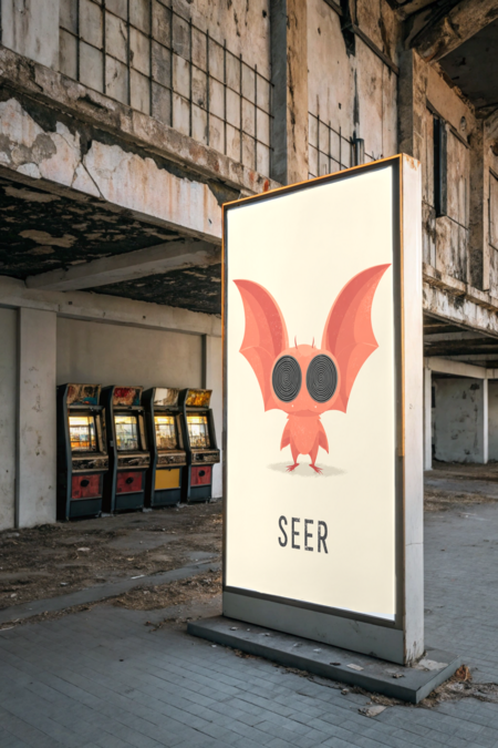 Midjourney: A poster with text logo «SEER». low poly, flat color illustration of a small cute coral bat like creature with large black spiral eyes and tiny angular coral wings, standing center frame in an abandoned arcade room —version 7 —aspect 3:4