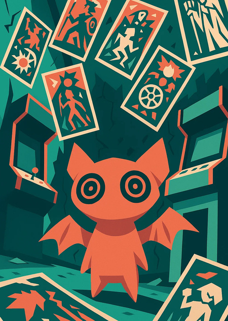 Sora: A low-poly, flat-color illustration of a small cute coral bat-like creature with large black spiral eyes and tiny angular coral wings, standing center-frame in an abandoned arcade. Floating dynamically around the creature are several stylized Tarot cards—each rendered in the same sharp geometric, flat-color aesthetic—depicting iconic Major Arcana symbols. The entire scene uses sharp geometric shapes, zero textures or gradients — only saturated flat fills in a palette of coral pink, dark teal, cream white, and light green. The room has cracked dark teal polygonal walls, trash (torn posters, wires, paper), two retro arcade cabinets (left: coral joystick + dark green screen; right: cream panel + light green screen), and scattered trash on the floor.