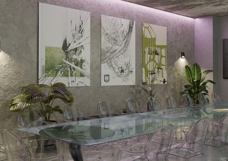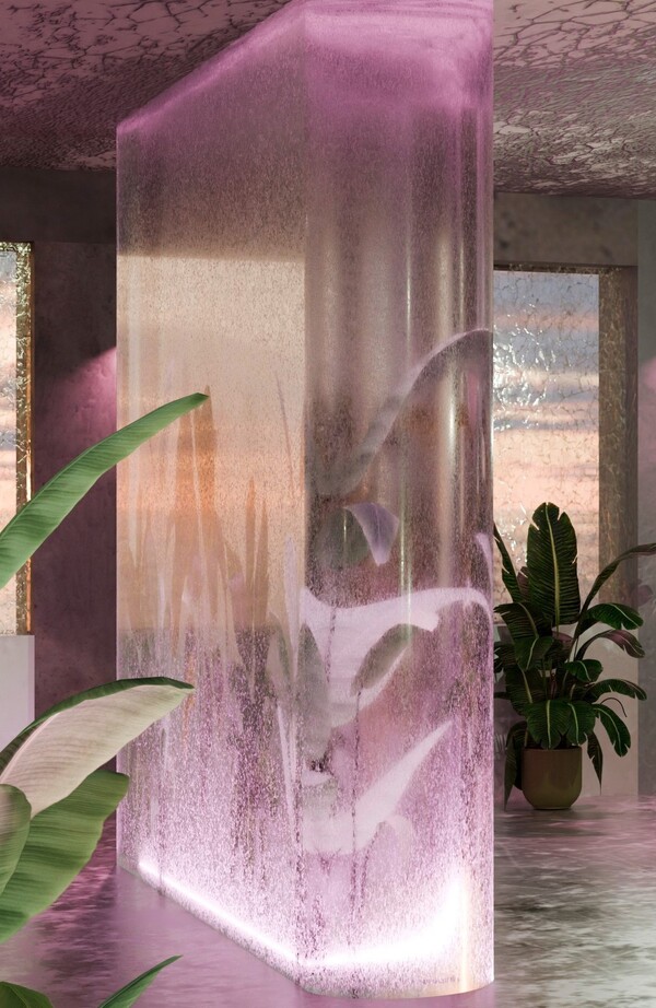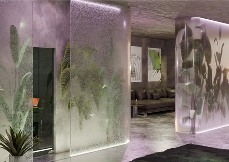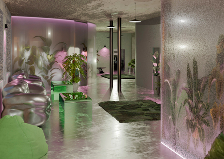 Все пространство выдержано в серых, нейтральных цветах, освещение же представляет собой приглушенный мягкий свет в сочетании с розовой яркой подсветкой