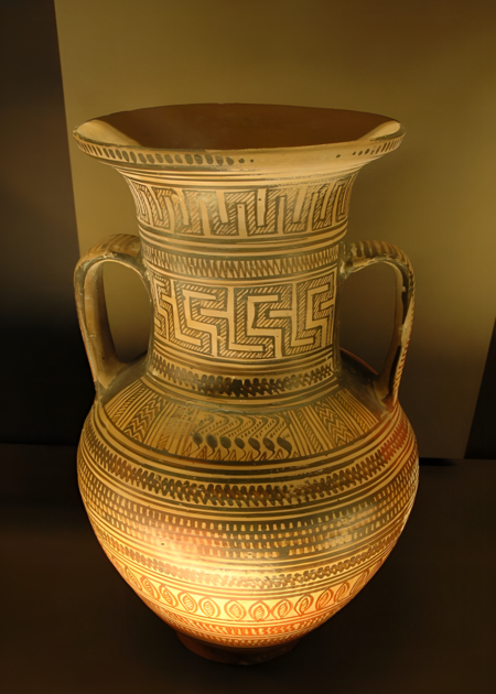 Справа — орнамент, характерный для геометрического стиля VIII века до нашей эры: строгий, повторяющийся, состоящий из прямых линий. Он приведён для того, чтобы показать переход узоров от декоративных элементов керамики к скульптуре.