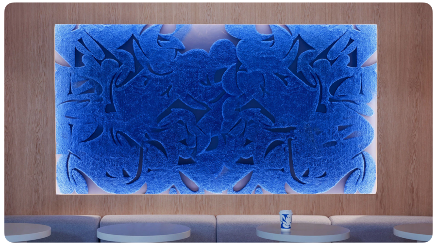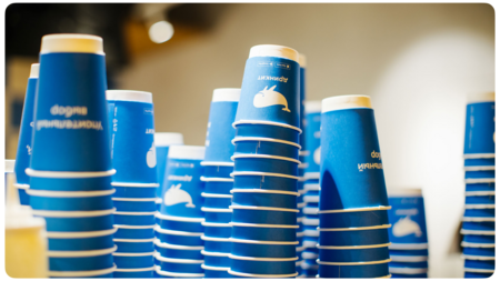 На фото — фирменные стаканы с силуэтами кита. Дружелюбный маскот стал символом бренда, отражая его открытость и доброжелательность с первых дней существования.
