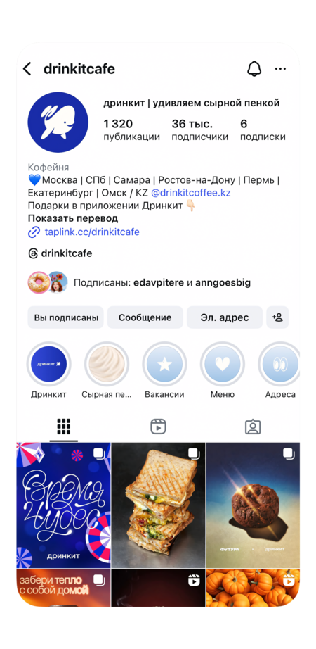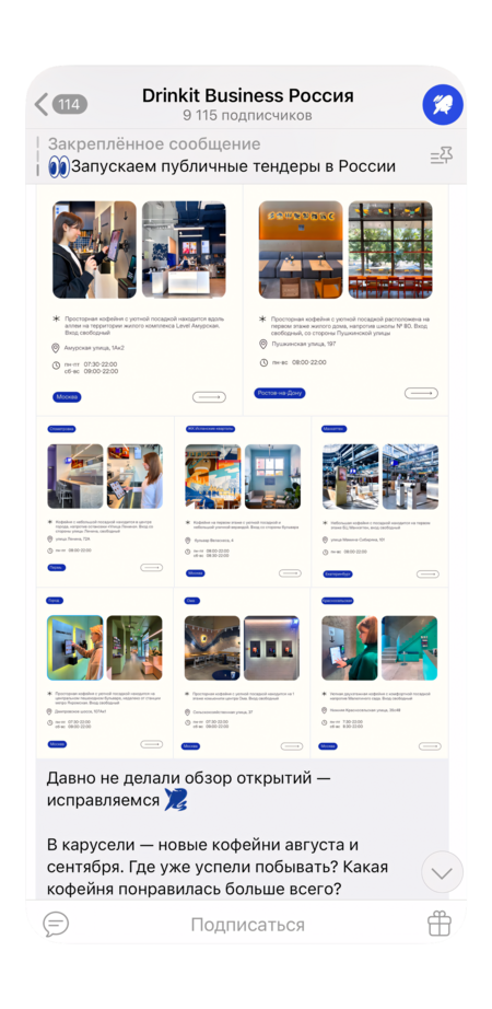 PR-акции и коллаборации: бренд активно проявлял себя офлайн через события. Продолжая традицию 2015 года, дринкит участвовал в городских фестивалях, устраивал дегустации и мастер-классы по альтернативному завариванию, организовывал собственные флешмобы (кофейные медитации — новый формат дегустации через ощущение цвета и фактуры, о чём рассказывала основатель бренда). В отдельных городах запускали разовые акции, подогревающие интерес: в Самаре разыгрывали лотерею среди первых клиентов (фотоотчёты таких событий публиковались в Телеграм-каналах). Также практиковались коллаборации с локальными пекарнями: limited edition десерты к Хэллоуину или авторские сиропы от партнёрских производств. Такие инициативы решают две задачи — генерируют инфоповод для соцсетей и подчёркивают связь дринкит с местным сообществом [9].