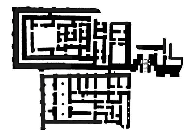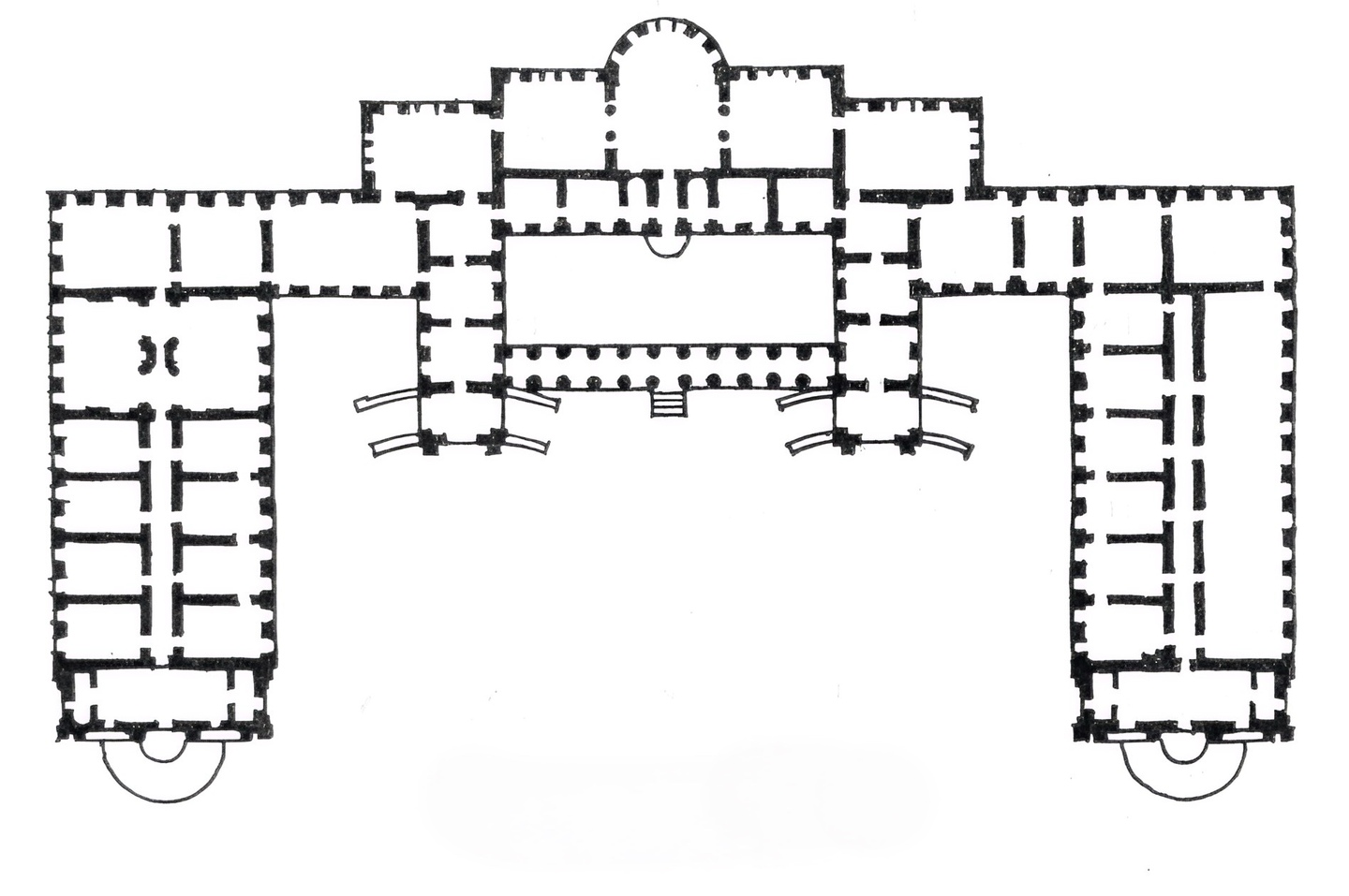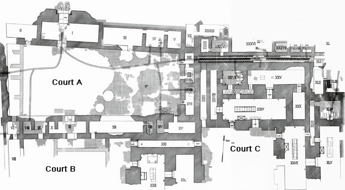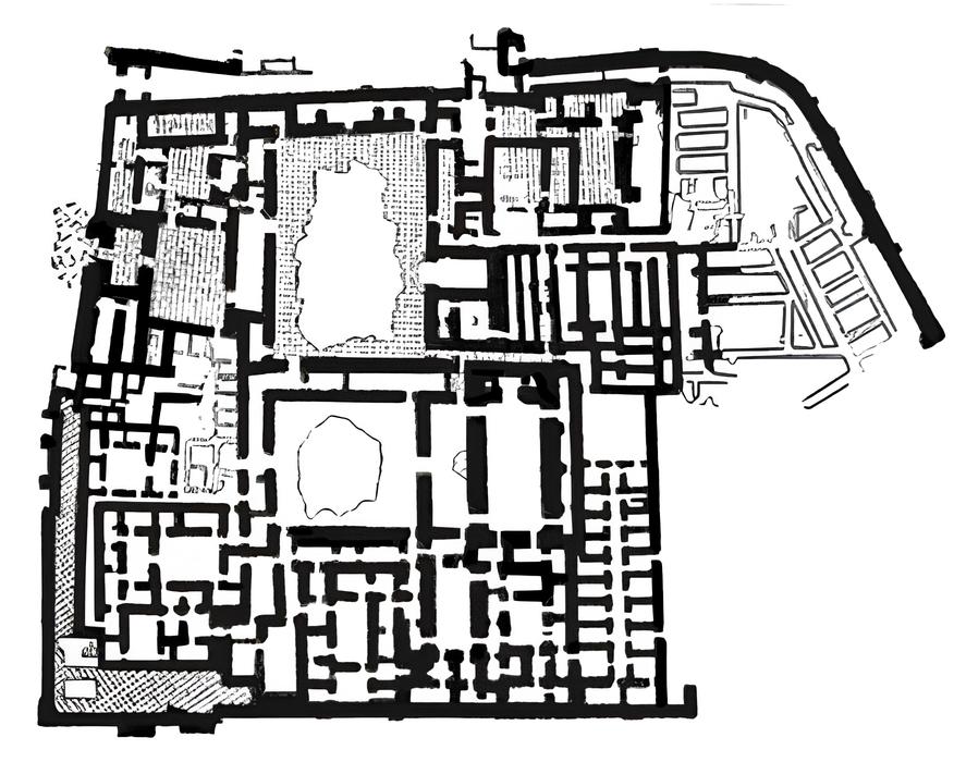 План южного дворца демонстрирует симметрично выстроенное пространство внутри комплекса — та же знакомая структура строения в Древнем мире.