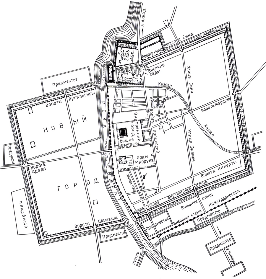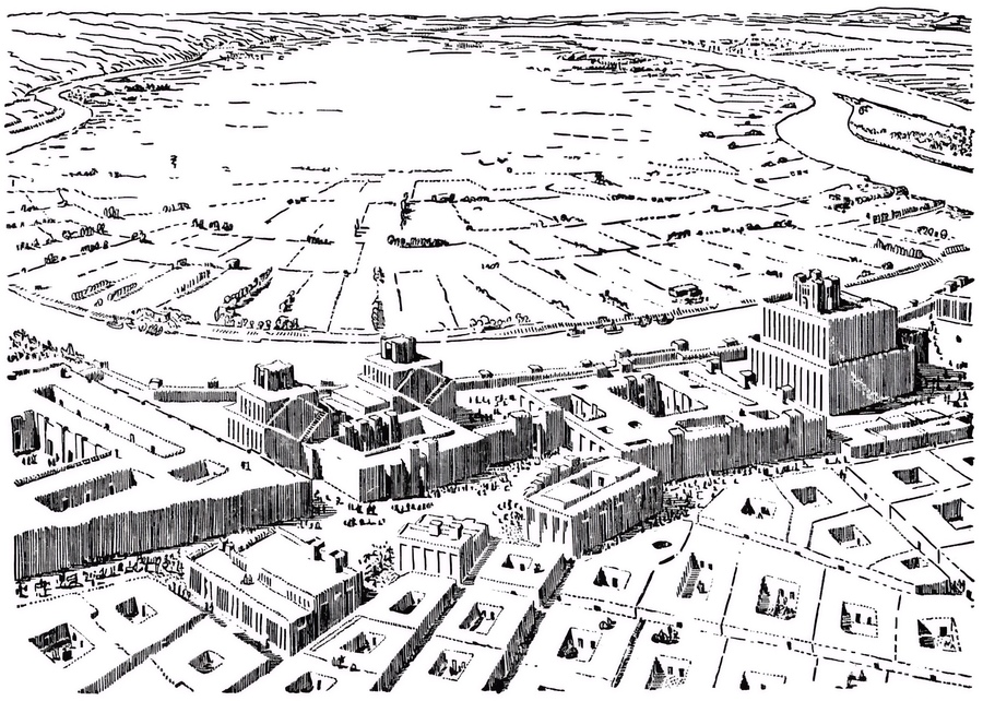 В Тиль-Барсипе ассирийская модель сохраняется: массивный дворцовый комплекс возвышается над городской застройкой, а его размещение у реки повторяет характерное расположение таких центров.