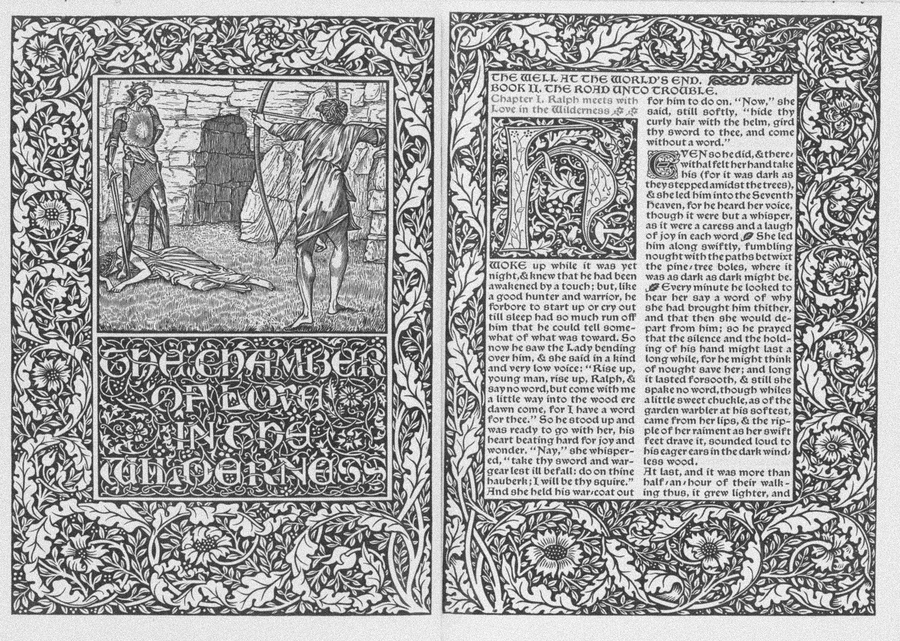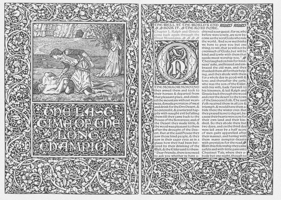 " The Well at the World’s End " («Колодец на краю света») было создано Уильямом Моррисом в 1892 году и стало одним из первых образцов фэнтези, основанных на средневековых легендах о рыцарях. В 1896 году оно было опубликовано в издательстве «Келмскотт-пресс». Для оформления книги использовался готический шрифт и сложный орнамент, которые отражали эстетические взгляды Морриса на гармонию формы и содержания.