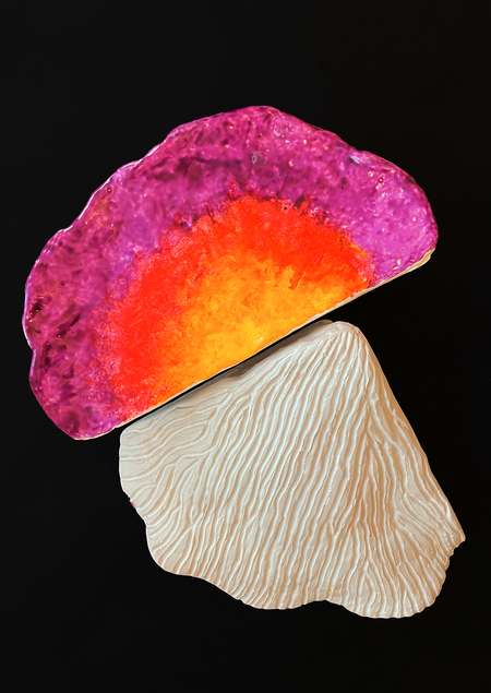 Древесные грибы по своей форме напоминают полку— у них достаточно плоская шляпка и они крепко держатся на дереве. Я создала серию настенных полок в форме древесных грибов. Форма отсылает к природным мотивам, но переосмысливается под практическое применение. Я сделала шляпку гриба ровнее, чтобы на полку можно было положить разные мелочи, такие как ключи или украшения.