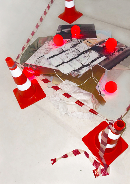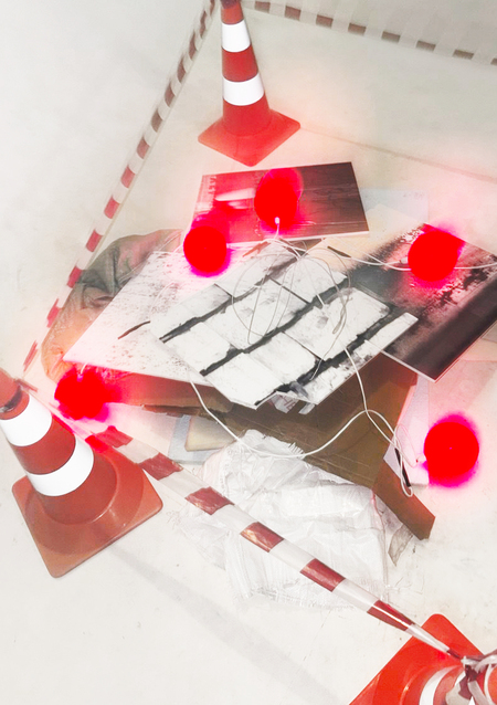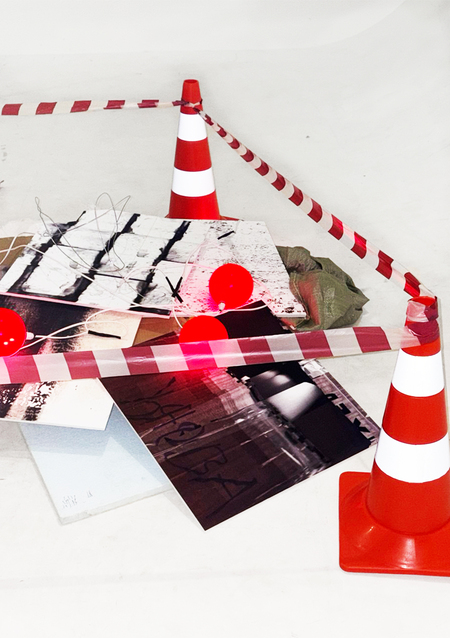 В своем проекте я передаю хаос через искривленные фактуры города, сделанные с помощью ручного сканера и напечатанные на пенокартоне, который также является материалом города. Я использую также городскую атрибутику, чтобы дополнить композицию: дорожные знаки и ограничительную ленту.