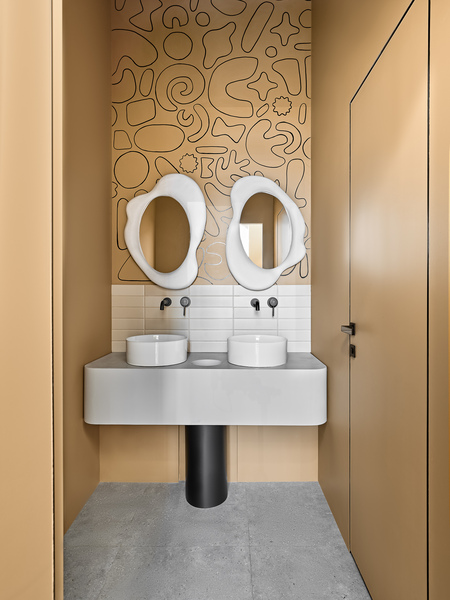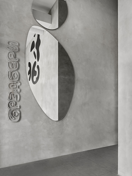 With the help of warm colors and oak veneer, we have created a comfortable atmosphere. A plastic light structure with soft lighting also helps to solve this problem. It, like the wardrobe partition, follows the shape of the desk and corporate identity elements. MDF panels are our most successful finishing material, which makes the greatest impression on guests. Handcrafted cement tiles from The Stone Manufactory were used for the floor, echoing the decoration of the walls and tables, which are all made of concrete by Statica for four. A large mirror was hung at the entrance for guests to take selfies.