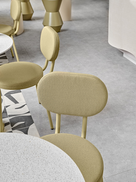 Most of the furniture in the room was custom-made, as we wanted each piece to be unique. One of the most interesting pieces was the rack, which repeated the shape and color of kneaded dough. The interior also featured bright examples of Russian design, including chairs from the St. Petersburg-based company Delo Design. The chandelier was a particular success. Not all contractors were willing to take on such a project, and many quoted sky-high prices in order to avoid taking the risk. It seemed like we might have to abandon the idea, but eventually, our estimators persuaded one manufacturer based on their communication data. They convinced him to create this design within the budget we had outlined. As a result, the chandelier has become one of the most striking elements in the room.