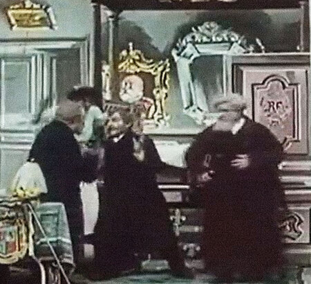 В начале фильма автор делит экран пополам. В правой его части изображен Париж, где президент Фальер готовится ко сну. В левой части в Букингемском дворце также укладывается спать Эдуард VII.