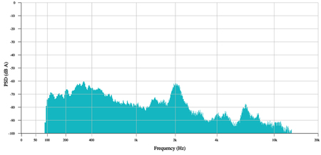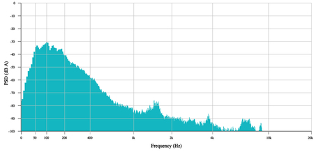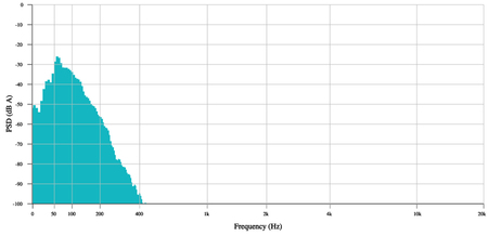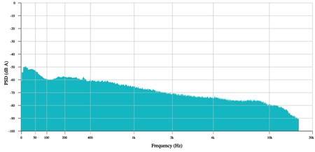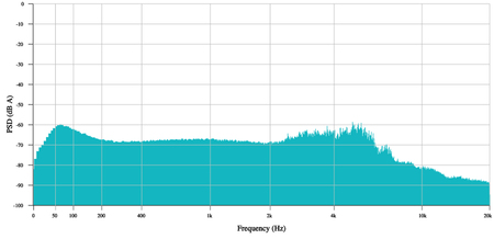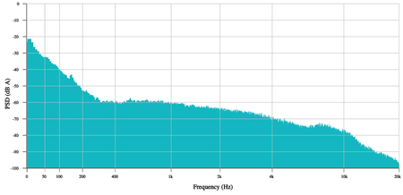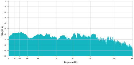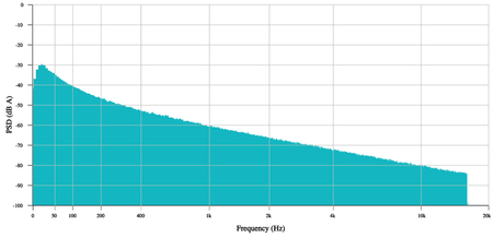 На спектрограмме виден плавный и умеренный спад мощности (PSD) от низких к высоким частотам. В нижнем диапазоне — максимум, затем спад по мере роста частоты, но не такой резкий и крутой, как у коричневого шума, что характерно для розового шума.