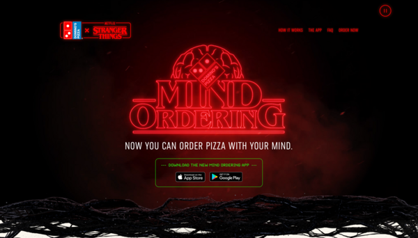 Отдельный пласт кампании — «Mind Ordering»: приложение, позволяющее «заказать пиццу силой мысли», оформленное как фантазийная технология из мира сериала. Это пример того, как fauxstalgia компенсирует отсутствие реального прошлого с помощью выдуманного опыта. Технология стилизована под научную фантастику 80-х, хотя сама по себе принадлежит современному цифровому маркетингу. Аудитория получает ностальгическое чувство, но не к реальной эпохе, а к её культурному образу.