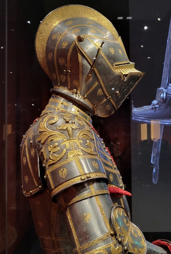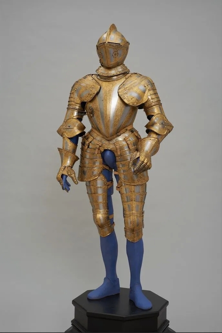 В XV веке, в позднее Средневековье, мы видим «готический» доспех — функциональный, скульптурный, пронизанный вертикальными линиями и сложной ковкой. Его образ в живописи и скульптуре подчеркивает священный статус рыцаря в священных латах. В XVI столетии Максимилиановский стиль и творения таких мастеров, как братья Хельмшмидты, превращают доспех в произведение искусства. Гравировка, травление и золочение создавали «архитектуру на теле», служа не только защите, но и утверждению абсолютной власти и богатства монарха и знати.