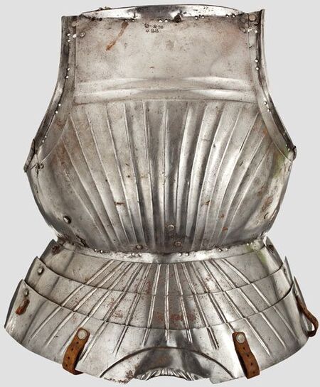 Еще одной отличительной особенностью была монолитная кираса, в отличие от составной готической. Несущей основой всего доспеха служило ожерелье, к которому крепились кираса и защита рук, а также оно являлось опорой для шлема.
