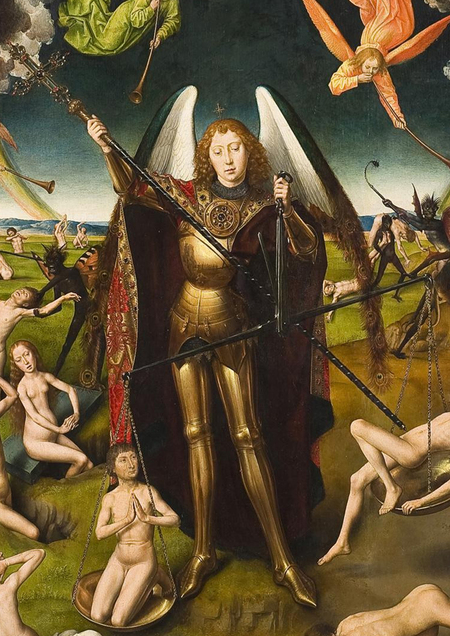 В центральной панели триптиха «Страшный суд» доспех Архангела Михаила на картине представляет собой характерный образец североевропейского позднеготического доспеха середины — конца XV века. Конструкция анатомическая, с выраженными угловатыми формами. Налокотники и наголенники ребристые, а обувь отличается длинными и острыми носками, что также является яркой чертой готического стиля. Функциональность подчеркивает полированная отделка без обильного декора.