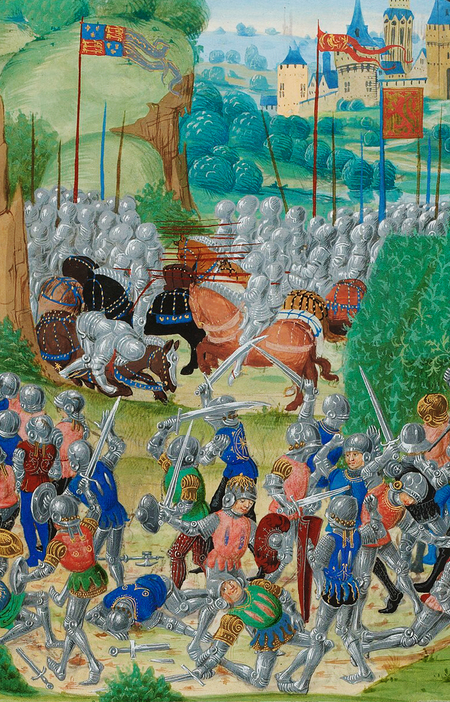 «Битва тридцати» (1351 г.), миниатюра из «Сборника хроник из истории Бретани» Пьера ле Бу, 1480 г.