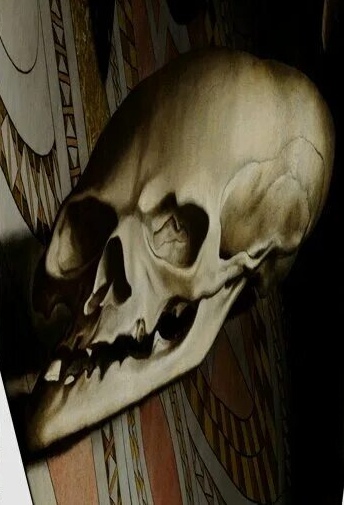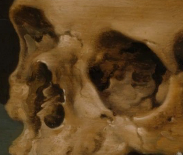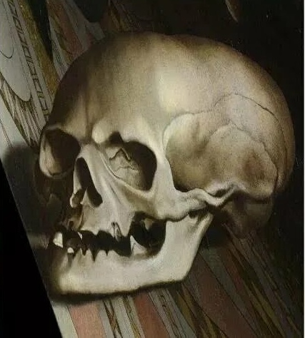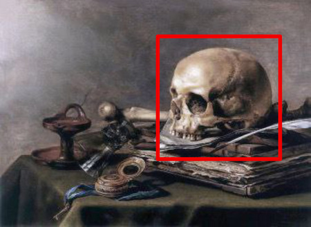 Череп — самый яркий символ бренности человеческой жизни. Он напоминает о неизбежности смерти. Это значительно важный атрибут приведённого жанра. Во-первых, портрет черепа является отражением когда-то живого человека, а более точно-головы. Зрителю стоит воспринимать это как «зеркало» временной жизни.